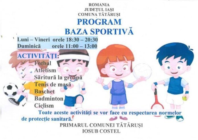Tinerii se pot bucura de activități în cadrul bazei sportive din comuna Tătăruși. Anunțul a fost făcut pe pagina de facebook a primăriei. Astfel, sunt oferite și informații despre activitățile care pot fi organizate, precum fotbal, atletism, tenis de masă, baschet, badminton sau ciclism.