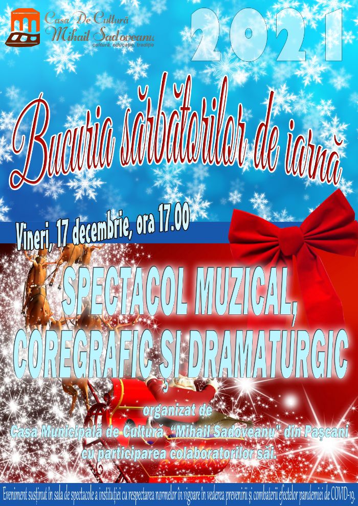 Luna decembrie ne aduce in acest an bucuria sarbatorilor de iarna, cu forfota si spectacolele de altadata. Casa de Cultura Mihail Sadoveanu din municipiul Pascani a anuntat ca la sfarsitul acestei saptamani va avea loc traditionalul spectacol de Craciun al institutiei publice – “Bucuria sarbatorilor de iarna”. Vineri, 17 decembrie, de la ora 17:00, cei care vor sa simta magia celei mai frumoase perioade din an pot vedea ce au pregatit membrii Casei de Cultura si colaboratorii sai. Va fi muzica, dansuri si teatru, cu tematica sarbatorilor de iarna.
