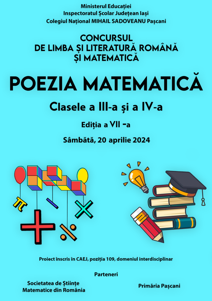 Colegiul Național Mihail Sadoveanu din municipiul Pașcani anunță reluarea organizării unui concurs cu tradiție, pentru elevii din clasele a III-a și a IV-a. Este vorba despre Concursul de limba romană și matematică POEZIA MATEMATICĂ, cea de-a VII-a ediție. Înscrierile se pot face până pe 15 aprilie.