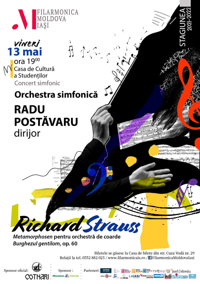 Orchestra simfonică a Filarmonicii „Moldova” din Iași și dirijorul RADU POSTĂVARU vă invită vineri, 13 mai 2022, începând cu ora 19,00 în sala Casei de Cultură a Studenților, la un minunat concert simfonic.