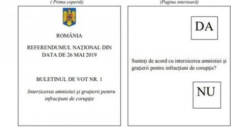Biroul Electoral Central a prezentat buletinele de vot pentru referendumul din 26 mai 2019, care va avea loc în aceeași zi cu alegerile europarlamentare. Autorităţile au decis că românii vor primi trei buletine de vot. Un buletin pentru alegerile europarlamentare şi alte două buletine pentru întrebările cuprinse în referendumul pe justiție. În premieră, în secţia de votare vor fi câte trei urne, iar validată va fi întrebarea care întruneşte cvorumul.
