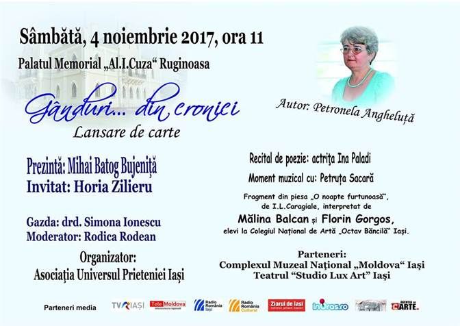 Sambata va invităm la cultură! Palatul “Al. I.Cuza” din Ruginoasa va găzdui o lansare de carte a profesoarei din comună, Petronela Angheluță. Volumul “Gânduri…din cronici”, apărut sub egida Asociaţiei “Universul Prieteniei”, va fi prezentat de scriitorul Mihai Batog Bujeniţă. La eveniment, va fi invitat de onoare și poetul Horia Zilieru.
