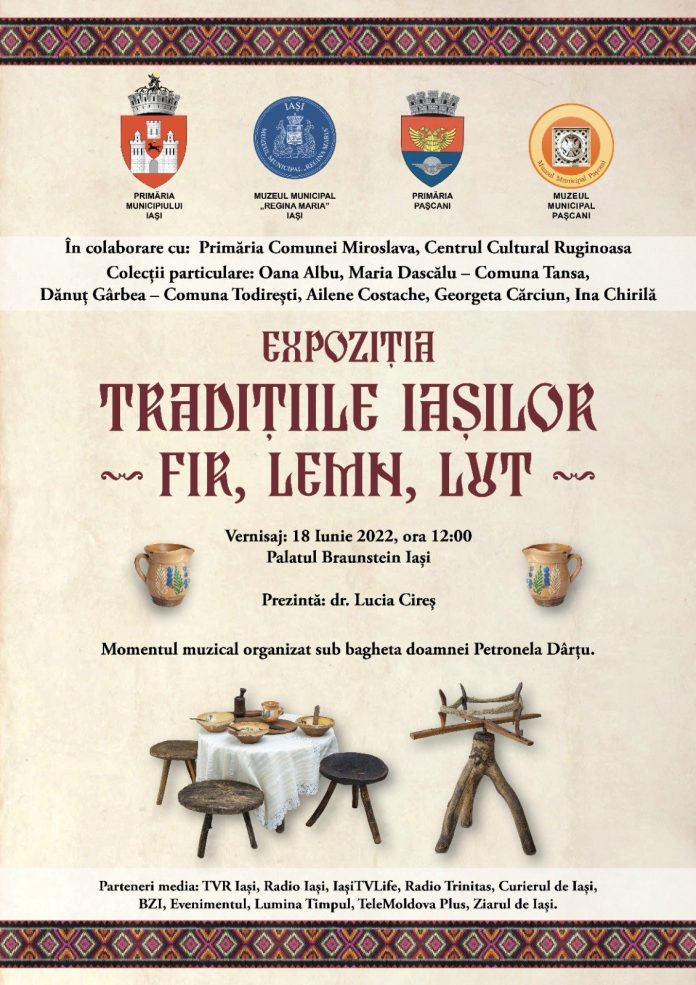 Obiecte tradiționale din Pașcani, Ruginoasa și Todirești vor fi expuse la Iași, la Palatul Braunstein, într-un proiect inedit sub numele ,,Tradițiile Iașilor – fir, lemn, lut-” un eveniment cultural unic prin tematică, activitățile propuse și valoarea bunurilor culturale expuse, ce va avea loc în perioada 15 iunie – 15 iulie.