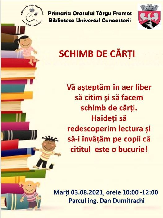 Îndemn la lectură pentru locuitorii orașului Târgu Frumos. În cadrul unui eveniment cultural-educativ, care se va desfășura marți, 3 august, între orele 10.00 – 12.00, în Parcul Ing. Dan Dumitrachi, din Târgu Frumos sunt așteptați la un schimb de cărți, toți pasionații de lectură.