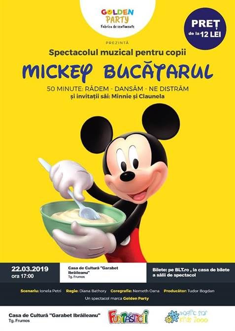 Casa de Cultura „Garabet Ibraileanu” Tg. Frumos va invita vineri, 22 martie, incepand cu orele 17:00 la specatcolul muzical pentru copii „Mickey Bucatarul”.