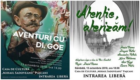 Evenimente in sir la sfarsitul acestei saptamani. Sambata, 13 octombrie, de la ora 14:00, Primaria Municipiului Pascani in parteneriat cu Ateneul din Iasi va organiza pe scena Casei de Cultura „Mihail Sadoveanu” un spectacol pentru copii. Cei mici vor putea vedea „Aventuri cu Dl. Goe”, in regia lui Iulian Ioan Sandu.
